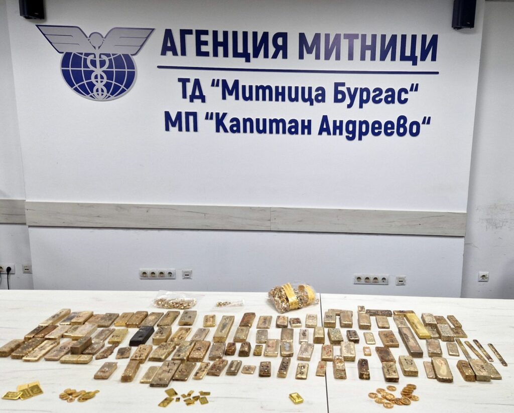 Близо 125 кг недекларирани златни отливки, кюлчета, монети и материал от златни изделия на обща стойност 10 600 197 лева са били открити на МП „Капитан Андреево“ в лек автомобил, излизащ от страната.