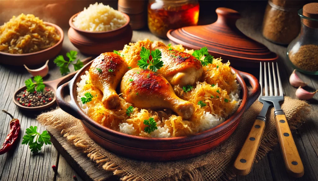 Ако търсите ястие, което съчетава зимния уют с традиционния вкус, тази рецепта за пилешко с кисело зеле и ориз е точно за вас! Приготвено в глинен съд, ястието запазва богатия си аромат и предлага неустоимо удоволствие.