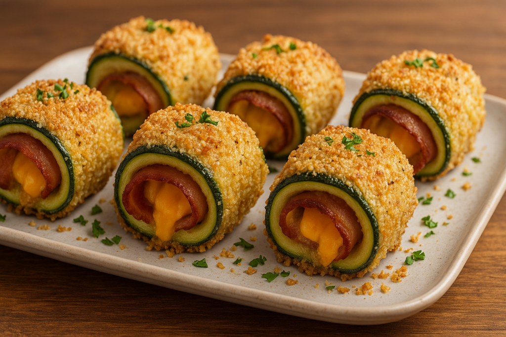 Сезонът на тиквичките е в разгара си, а ако сте от хората, които обичат да експериментират в кухнята, тази рецепта е точно за вас. Предлагаме ви лесна, но ефектна идея за рулца от тиквички, пълнени с чедър, увити в бекон и оваляни в хрупкава смес от яйце, галета и пармезан. Перфектни за гости, барбекю или гурме вечер у дома.