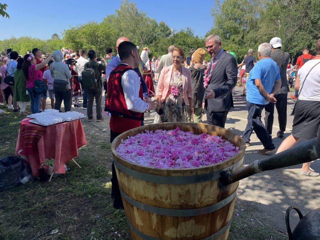 По стара българска традиция гостите бяха посрещнати с хляб и сол и се насладиха на реализацията на ритуала „Розобер“ и на присъствието на Царица роза 2024 Неделина Неделчева и подгласничките й, които блестяха величествено на фона на розовите полета.