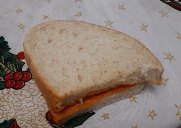 Ученици получиха за училищна закуска две половинки от една филия, тънко намазани с лютеница. Това се е случило в Самоков, съобщава възмутен родител в социалната мрежа Фейсбук.