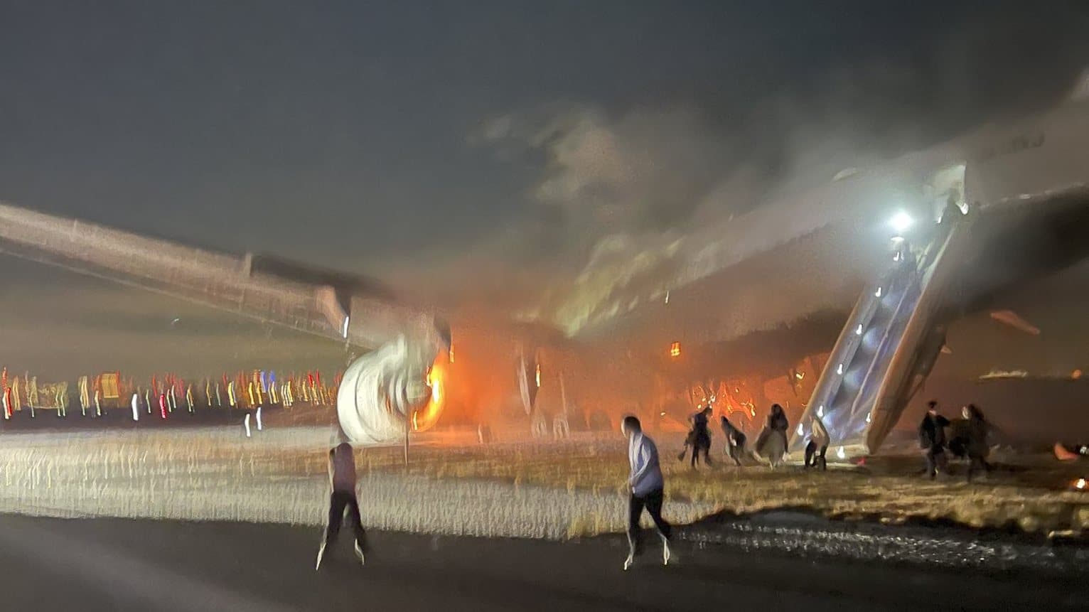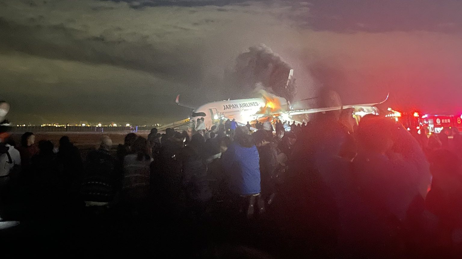 Местно телевизионно видео показва голямо изригване на огън и дим от страната на самолета на Japan Airlines, докато рулира по пистата. Тогава се запалва зоната около крилото. Кадри час по-късно показват, че самолетът е напълно обхванат в пламъци. Телевизия NHK съобщи още, че самолетът е Airbus A-350, който е летял от летище Шин Читосе, близо до град Сапоро, за Ханеда.