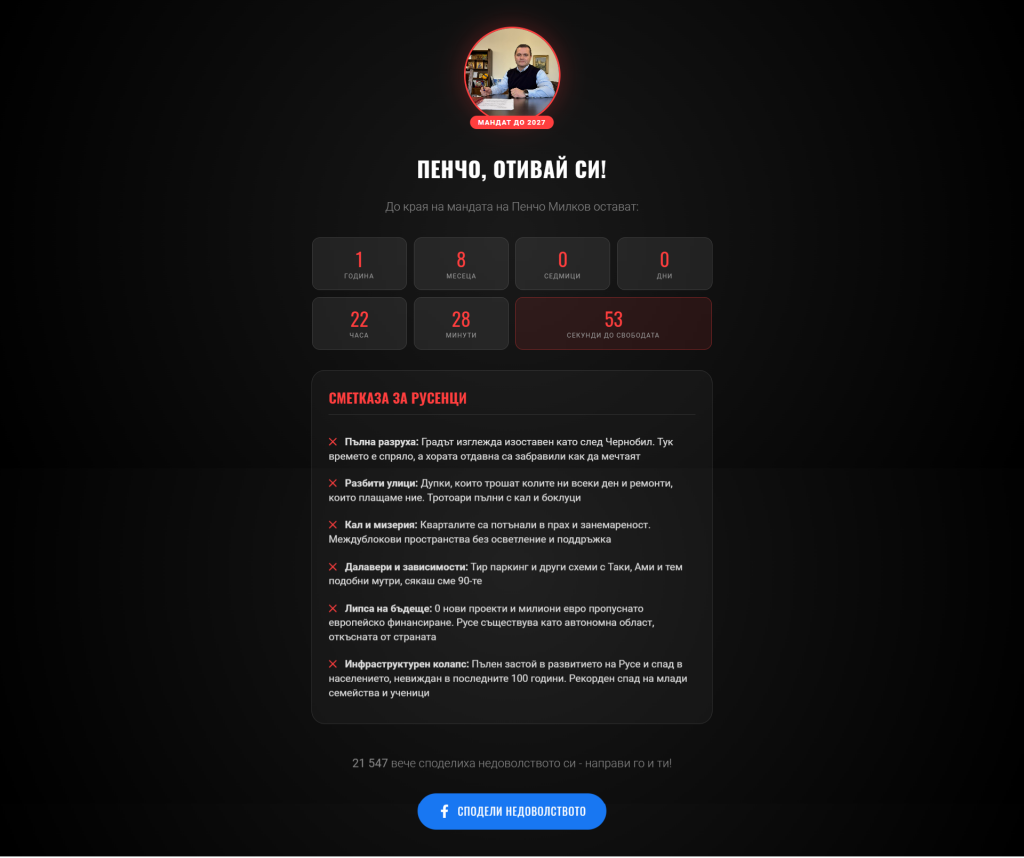 Граждани на Русе създадоха сайт, който отброява оставащото време до края на мандата на кмета Пенчо Милков (БСП за България) през 2027 г., придружен от призив „Пенчо, отивай си!“.