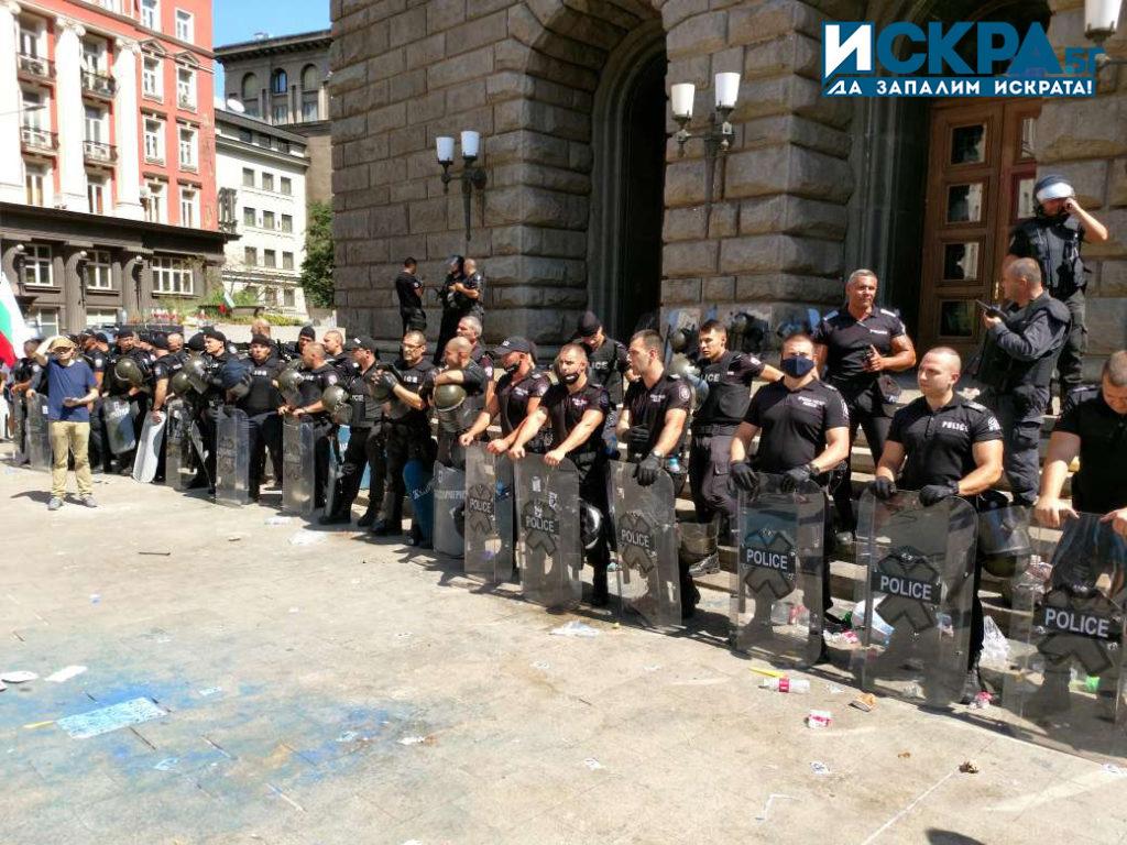 От Столичната дирекция на вътрешните работи /СДВР/ обявиха на извънреден брифинг, че са успели да запазят мира по време на сутрешното напрежение между полицията и протестиращите. Те твърдят, че срещу униформените се били изправили хора с криминални прояви и ултраси. Били използвани колове, спрей, павета и камъни. Разбиране не е имало, въпреки полицаите с жълти жилетки на първа линия. А това било мирен знак и затова се е стигнало до директен сблъсък между служители на реда и демонстранти пред Народното събрание.