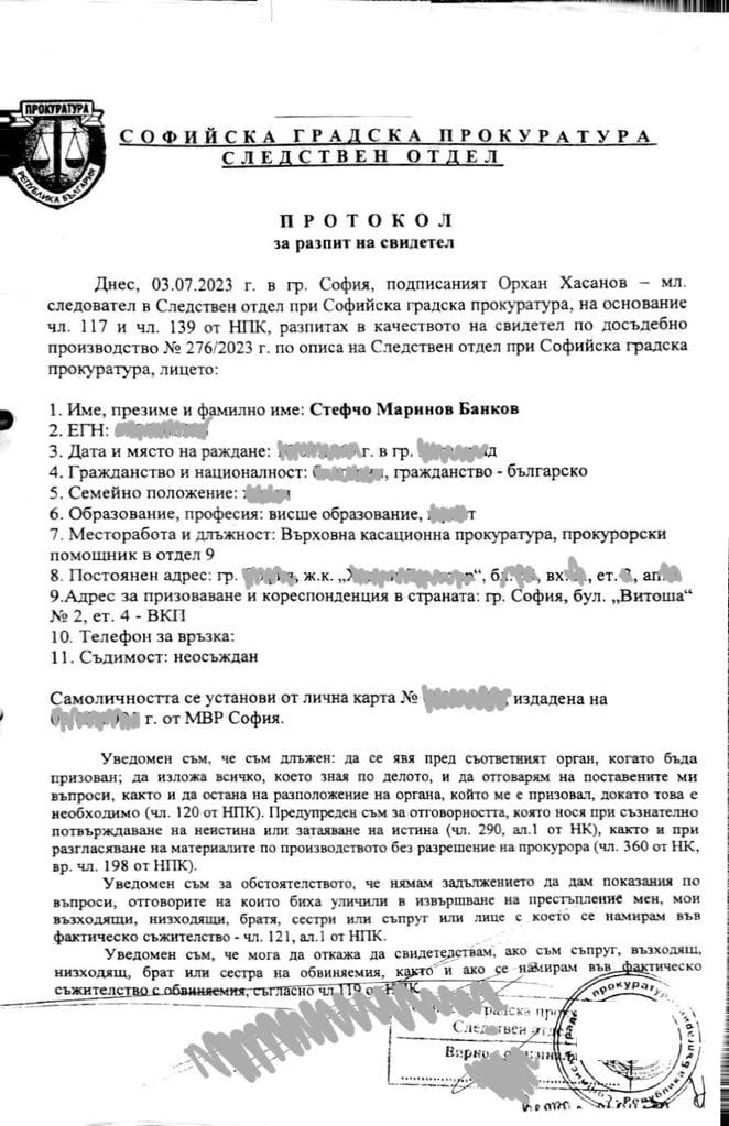 Сигналът е депозиран на 30 юни 2023 г. и още на следващия работен ден, 3 юли 2023 г., започва серия разпити на едно от споменатите лица – бившия директор на дирекция „Вътрешна сигурност“ на МВР и тогавашен прокурорски помощник Стефчо Банков, който работи във ВКП на пряко подчинение на бившия главен прокурор Сотир Цацаров. След публикуване на снимките пред ресторанта „Осемте джуджета“ на Борислав Сарафов и Петьо Петров-Еврото в края на май 2023 г., Банков беше посочен от Сарафов като оперативен ръководител на нелегалното частно външно наблюдение на Гешев, направило заснемането.