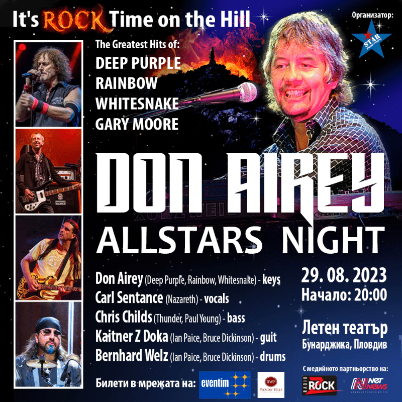„Това ще бъде наистина впечатляващо и невиждано досега!”, обяви самият Дон Еъри. Легендарният кийбордист представя у нас специалния си проект DON AIREY ALLSTARS с мега рок хитове, в чието създаване самият той е участвал като музикант.