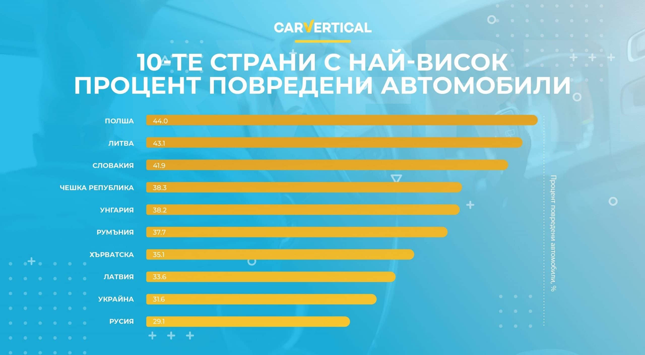 По време на проучването, carVertical анализира докладите за автомобилни истории от различни европейски страни. Резултатите в таблицата по-долу показват в кои държави процентът на повредени коли е най-висок.
