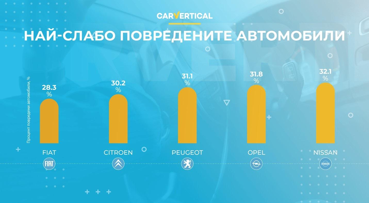 Таблицата по-долу показва петте марки автомобили в Европа, които е най-вероятно да бъдат повредени, спрямо докладите на carVertical. Това са моделите с най-чести повреди. Всички коли имат различни характеристики и биват популярни сред различни типове водачи.