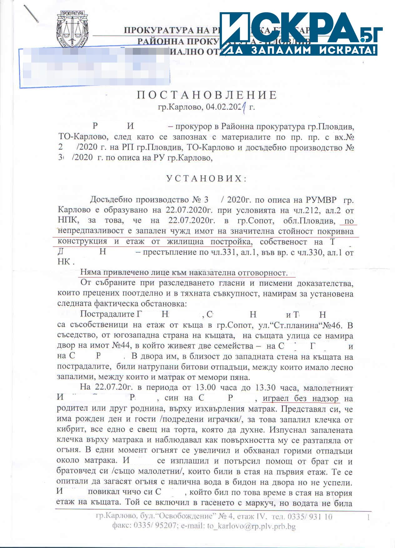 В предявяването на материалите е записано, че пожарът е тръгнал от съседите им, но извършителят е неизвестен, твърдят пострадалите от пожара. Те поискали да бъде разпитан някой възрастен.