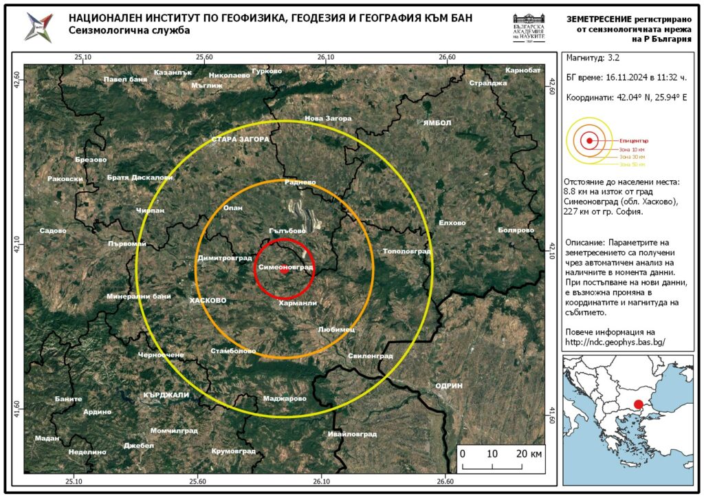 Днес в 11:32 часа българско време Националният Сеизмологичен Център към Националния Институт по Геофизика, Геодезия и География БАН регистрира земетресение с магнитуд 3,2 близо до Симеоновград.