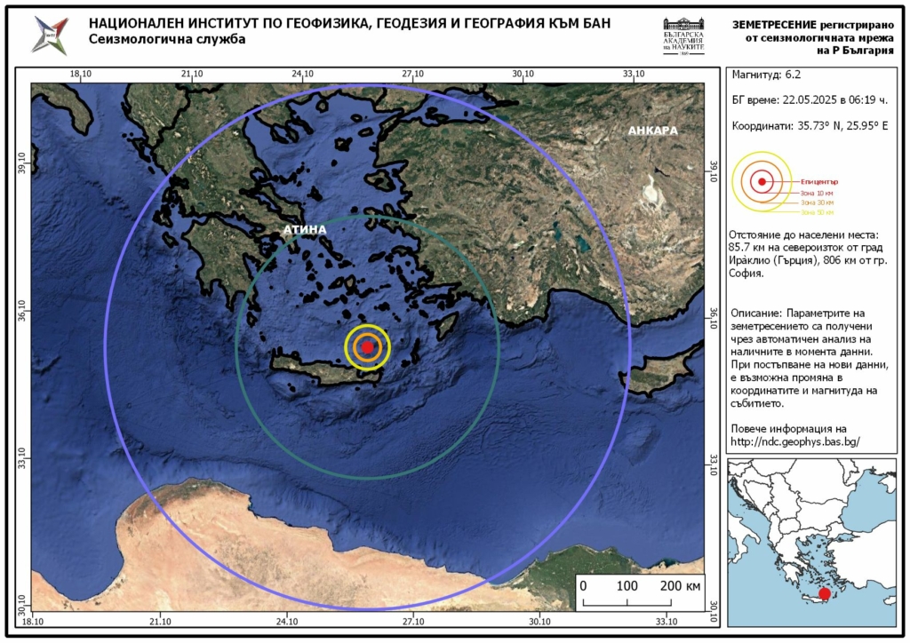 Тази сутрин, земетресение с магнитуд М=6.2 е регистрирано в района на остров Крит, Гърция.