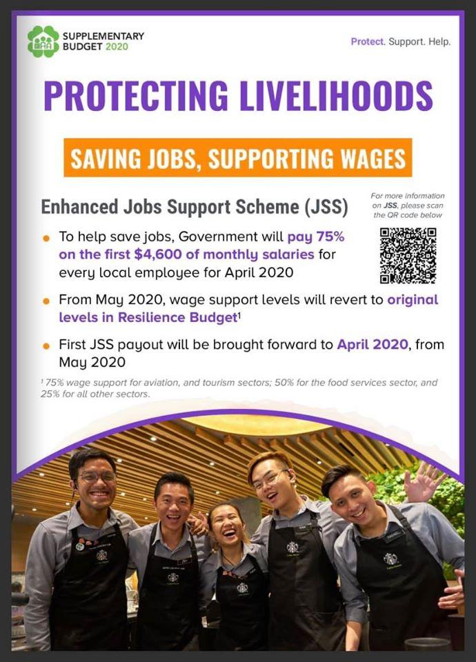 В първоначалния “Бюджет за устойчивост” схемата за подкрепа на заетостта субсидираше само 25% от първите 4600 долара брутни месечни заплати. Това бе за всички местни служители (сингапурски граждани). Предоставяха се по-високи нива на субсидии за трудово възнаграждение за секторите, които са по-пряко засегнати – 50% за фирмите, занимаващи се с хранителните услуги и 75% – за секторите на авиацията и туризма.