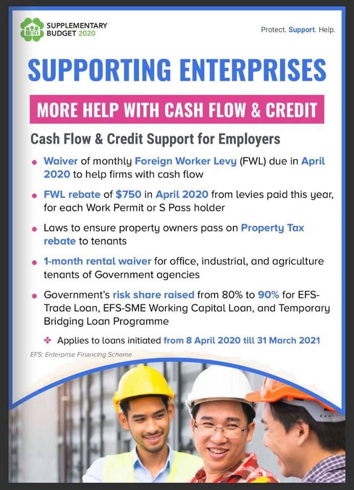 За да им се помогне да запазят своята бизнес структура и бързо да възобновят операциите си, на тези работодатели се предоставя и отстъпка за такса на чуждестранни работници. Тя е от 750 долара за всяко разрешение за работа или притежател на S-pass работна виза, въз основа на предишни такси, платени през 2020-та година.