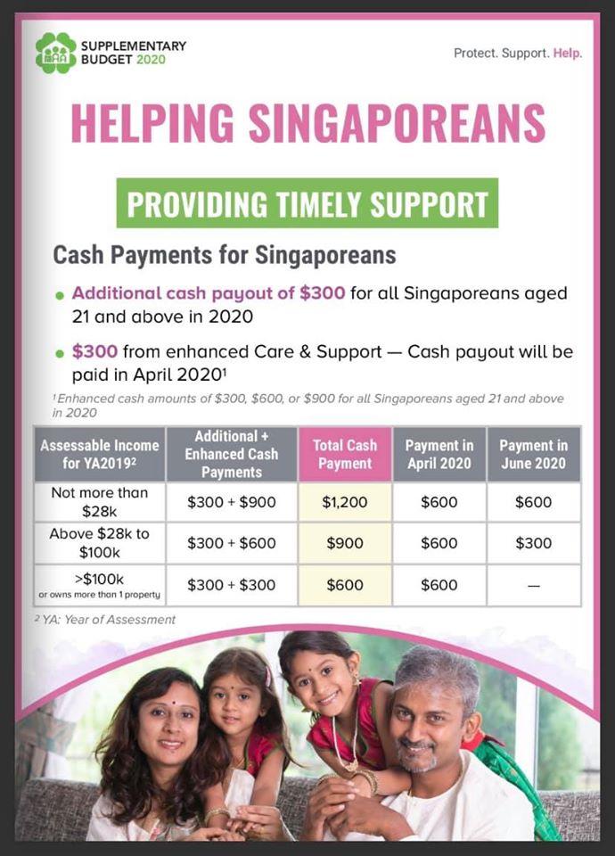 Всички пълнолетни сингапурски граждани ще получат еднократно “солидарно плащане”. То е в размер на 600 долара, които се дават в брой. В предишния бюджет тази сума беше 300 долара. За по-голямата част от сингапурците, предоставили данните на банковата си сметка на правителството, “плащането солидарност” ще бъде преведено директно в банковите им сметки до 14 април 2020-та година. Останалите ще получат парите с чек, на етапи.