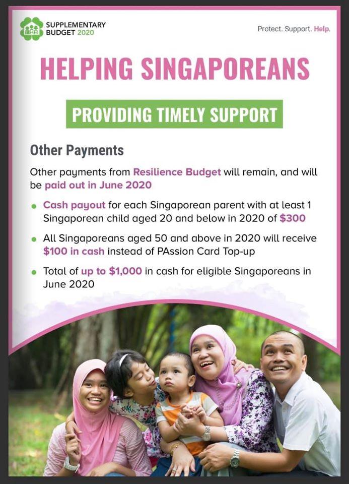 Допълнително ще се изплатят по 300 долара за всеки родител, който има поне едно дете на възраст до 20 години. Ще се допълнят по 100 долара към т.нар. “PAssion Card”, които ще бъдат изплатени в брой на всеки сингапурски гражданин, който е на възраст над 50 години.