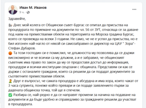 В своя пост Иван Иванов повдига още един важен въпрос и той е за самата процедура по подаване на документи за въпросните обекти в Морската градина, която според него е абсурдна, защото хората се редят на дълги опашки и който първи подаде документи, той печели.