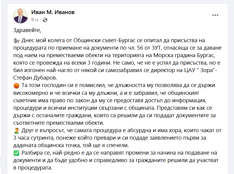 „Този господин си е помислил, че длъжността му позволява да се държи високомерно и че всички са му длъжни, а и е забравил, че общинският съветник има право по закон да му се предоставя достъп до информация, процедури и всички институции, свързани с общината. Представям си как се държи с останалите граждани, които са решили да си подадат документите за съответните преместваеми обекти“, е написал още Иван Иванов.