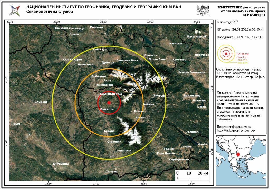 По данни на Националния Сеизмологичен Център към Национален Институт по Геофизика, Геодезия и География – БАН, на 24 януари 2026 г., в 06:50 ч., бе регистрирано земетресение с магнитуд 2.7 в района на град Благоевград!