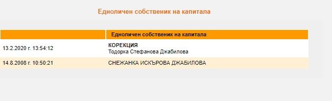 Припомняме, че при направена справка в Търговския регистър миналата година, излезе, че Снежанка Искърова Джабилова е едноличен собственик и управител във фирма „СТЕИСИ“ ЕООД. Към днешна дата обаче това е променено и за управители и едноличен собственик на капитала се води Тодорка Стефанова Джабилова.