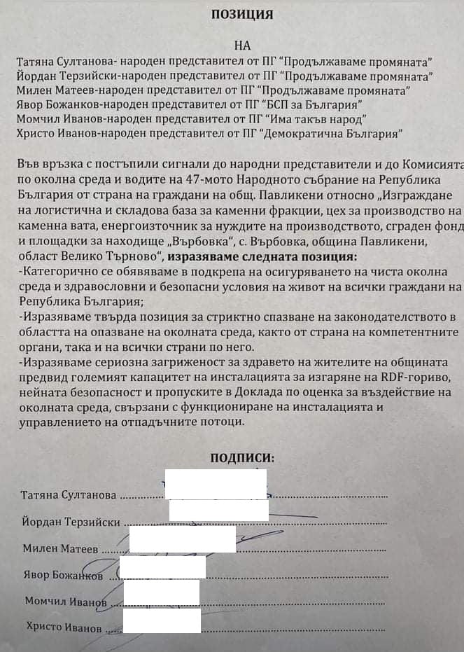 Местните жители се надяват казусът с изграждането на завод за изгаряне на отпадъци и производство на каменна вата в село Върбовка да се реши в най-скоро време. Те имат подкрепата от група народни представители от „Продължаваме Промяната“, „БСП за България“, „Има такъв народ“ и „Демократична България“ – Татяна Султанова, Йордан Терзийски, Милен Матеев, Явор Божанков и Момчил Иванов.