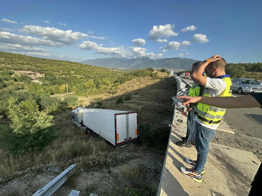 Сигнал за произшествието е получен в 15:37 часа вчера при РДПБЗН-Кюстендил. То е възникнало между товарен автомобил с румънска регистрация и „БМВ 320“ на 60 км от магистралата. Товарният автомобил е спукал гума, ударил се в мантинелата и преминал в насрещното платно, където се е ударил в лекия автомобил. След сблъсъка в „БМВ“-то товарният автомобил е паднал в дере /около 8 метра/.