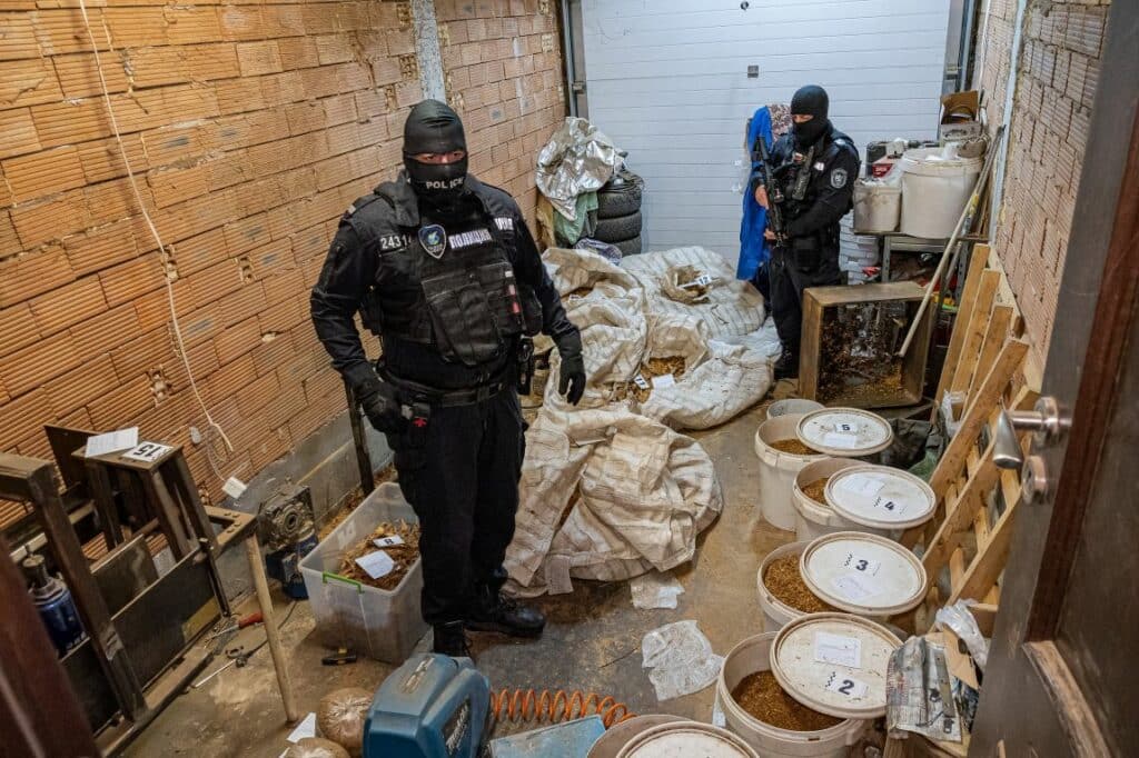 При последвалите процесуално-следствени действия са намерени и иззети 5400 къса цигари без бандерол, около 150 килограма нарязан тютюн, пакетиран в пластмасови съдове, 150 килограма тютюн на листа, девет кашона с филтри за пълнене на цигари, множество картонени заготовки за производство на кутии за цигари.