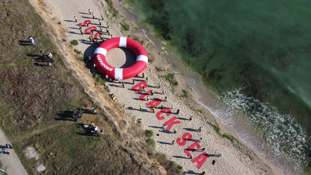 Активисти на „Грийнпийс“ от България и Румъния разпънаха огромен спасителен пояс на пясъчната граница между двете държави. Заедно те настояха за забрана на нови сондажи за нефт и газ по дъното на Черно море. Събитието се състоя днес, като в него се включиха близо 50 участници.