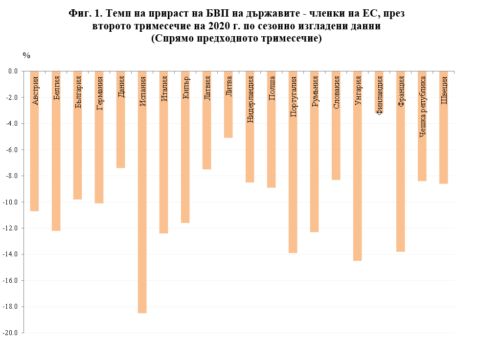 През второто тримесечие на 2020 г., в сравнение със същото тримесечие на предходната година, най-нисък спад отчитат Литва – 3.7%, Финландия – 5.2%, Полша – 7.9%, и България – 8.2%. Най-голям икономически спад според сезонно изгладените данни се наблюдава в Испания – 22.1%, Франция – 19.0%, Италия – 17.3%, и Португалия – 16.3%.