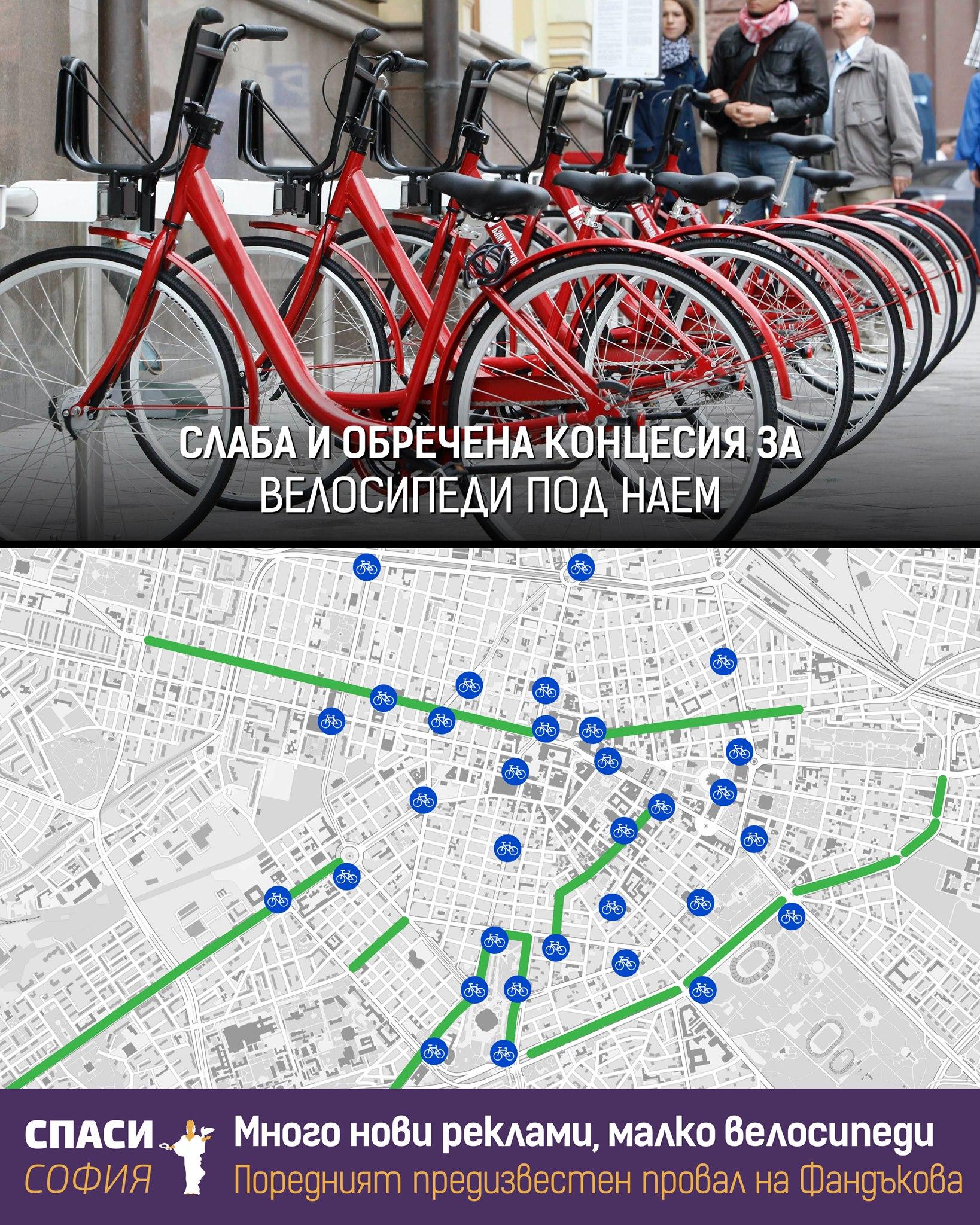 ГЕРБ и столичният кмет Йорданка Фандъкова са на път да пробутат поредната скандална концесия, алармират от гражданската организация „Спаси София“. Оттам обясняват, че скрито зад нуждата на София да получи система за велосипеди под наем, управляващите ще пробутат голяма концесия за нови реклами в идеалния градски център, където билбордовете са ограничени, а цените – високи. Те споделят за проблемите, които поражда концесията, във Facebook: