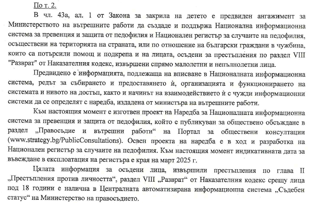 2. МВР предвижда ли изготвяне на Национален регистър на педофилите и ако да – кога ще бъде създаден. Ако не – защо няма да бъде създаден.