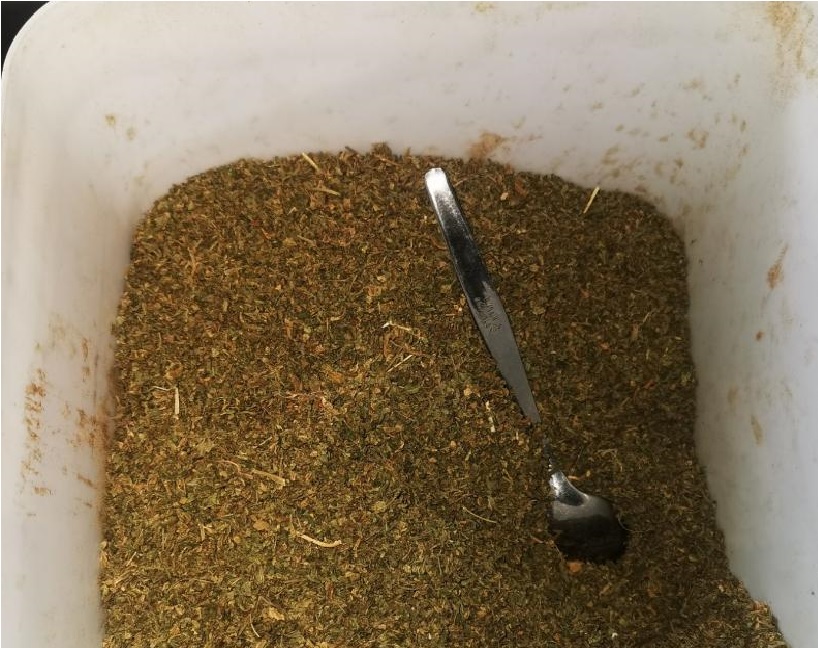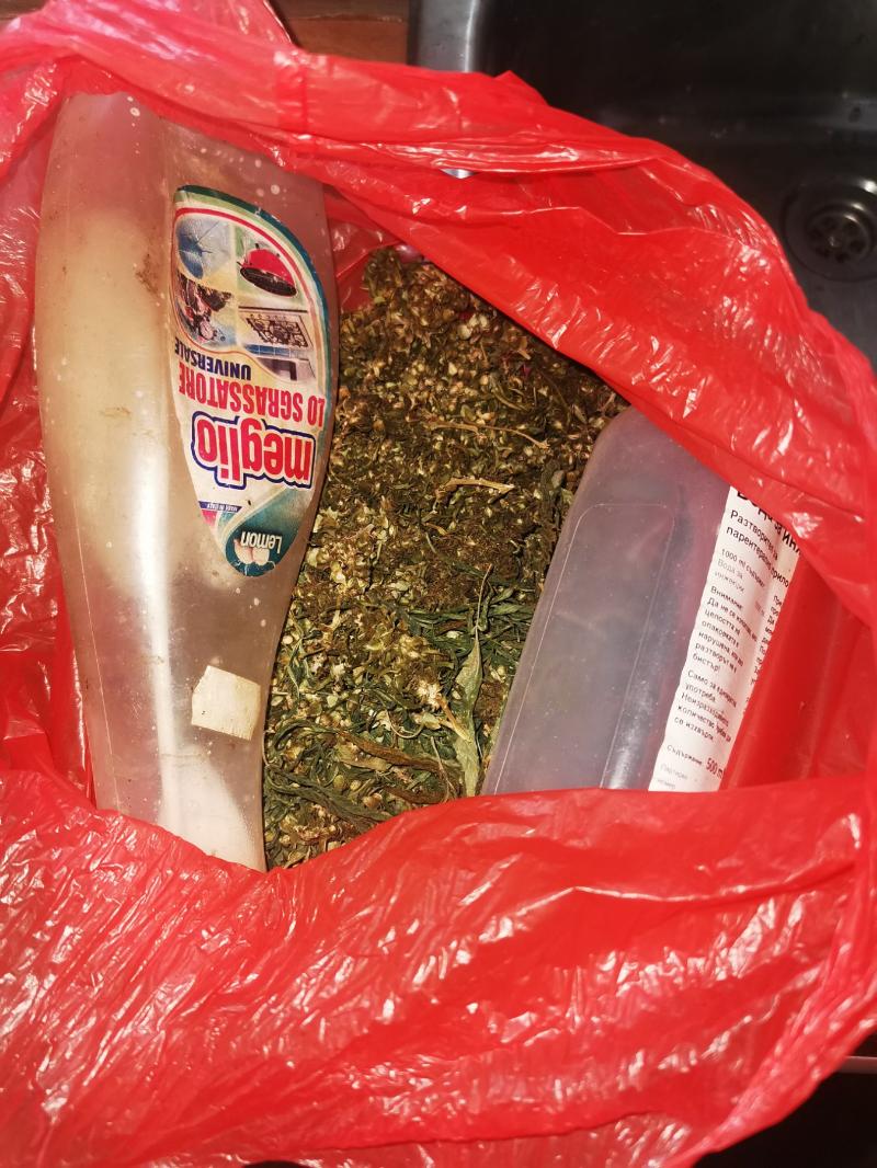 В предверието на постройка, обособена отделно от къщата, полицейските служители открили два найлонови плика, съдържащи ситно смляна зелена тревиста маса, кофа със стръкове зелена тревиста маса и кутия със суха зелена тревиста маса. Допълнително, при извършения личен обиск на 36-годишния мъж, у него било намерено пликче със суха зелена тревиста маса.