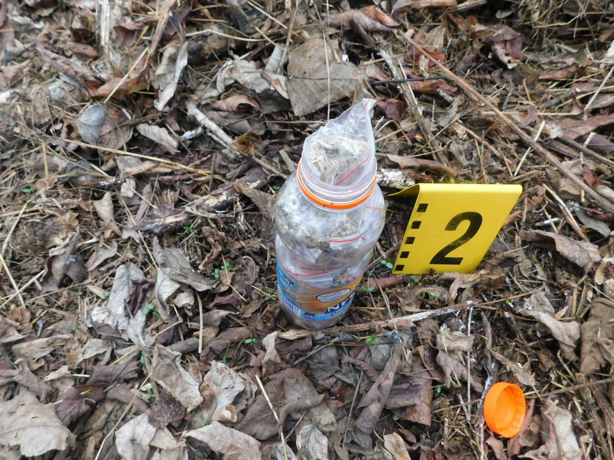 В гористата местност са били намерени заровени в земята пластмасово шише и кутия, пълни с полиетиленови пликчета с канабис. Общият им брой е 66, а теглото 115,20 грама.
