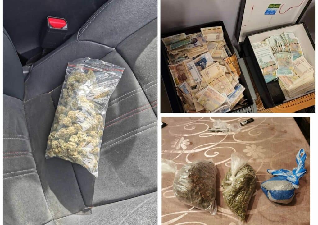 По време на разследването служителите на реда са предприели претърсване на два апартамента, обитавани от водача на колата. В жилищата са намерени и иззети: зелена тревиста маса – марихуана; бяло кристално вещество – метамфетамин, кокаин, както и няколкостотин хапчета екстази, видно от направената експертна справка. Полицаите са иззели също така гриндер, електронна везна и много голяма сума пари – в различна валута.