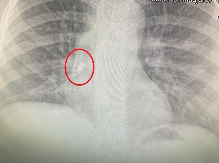 След известно време синът й започва да вдига температура, лекуван е с антибиотици, но температурата продължава. Личният лекар назначава рентгеново изследване и на снимката се вижда зъбът. От него се е развила инфекция на дихателните пътища, което обяснява повишената температура. Момчето е прието по спешност, операцията е извършена почти веднага от УНГ-специалистите доц. д-р Даниел Петков, д-р Ивайло Илиев и анестезиолога д-р Антон Григоров.