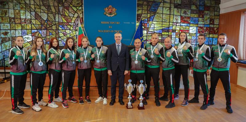 Спортният министър връчи почетни плакети на българските състезатели по кикбокс, които спечелиха 19 отличия – 6 златни, 3 сребърни и 10 бронзови, в индивидуалните дисциплини на Световното първенство по кикбокс в Албуфейра, Португалия.