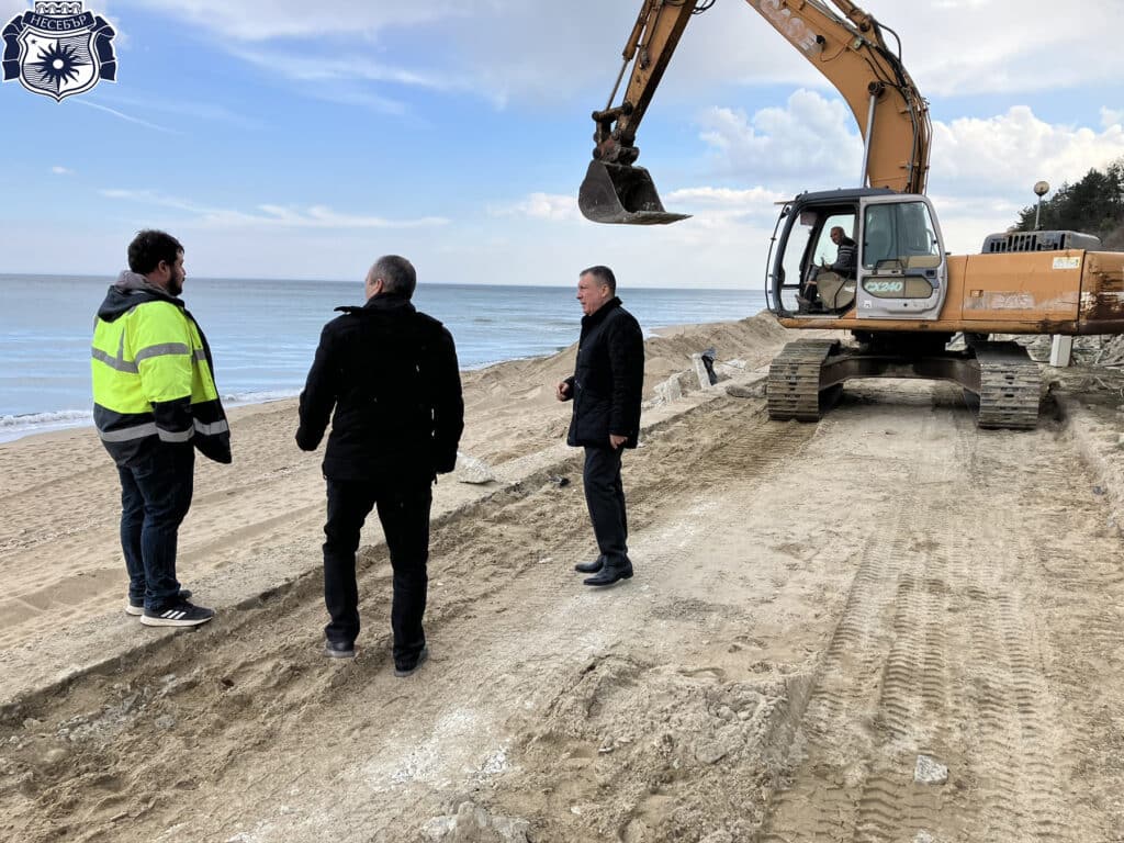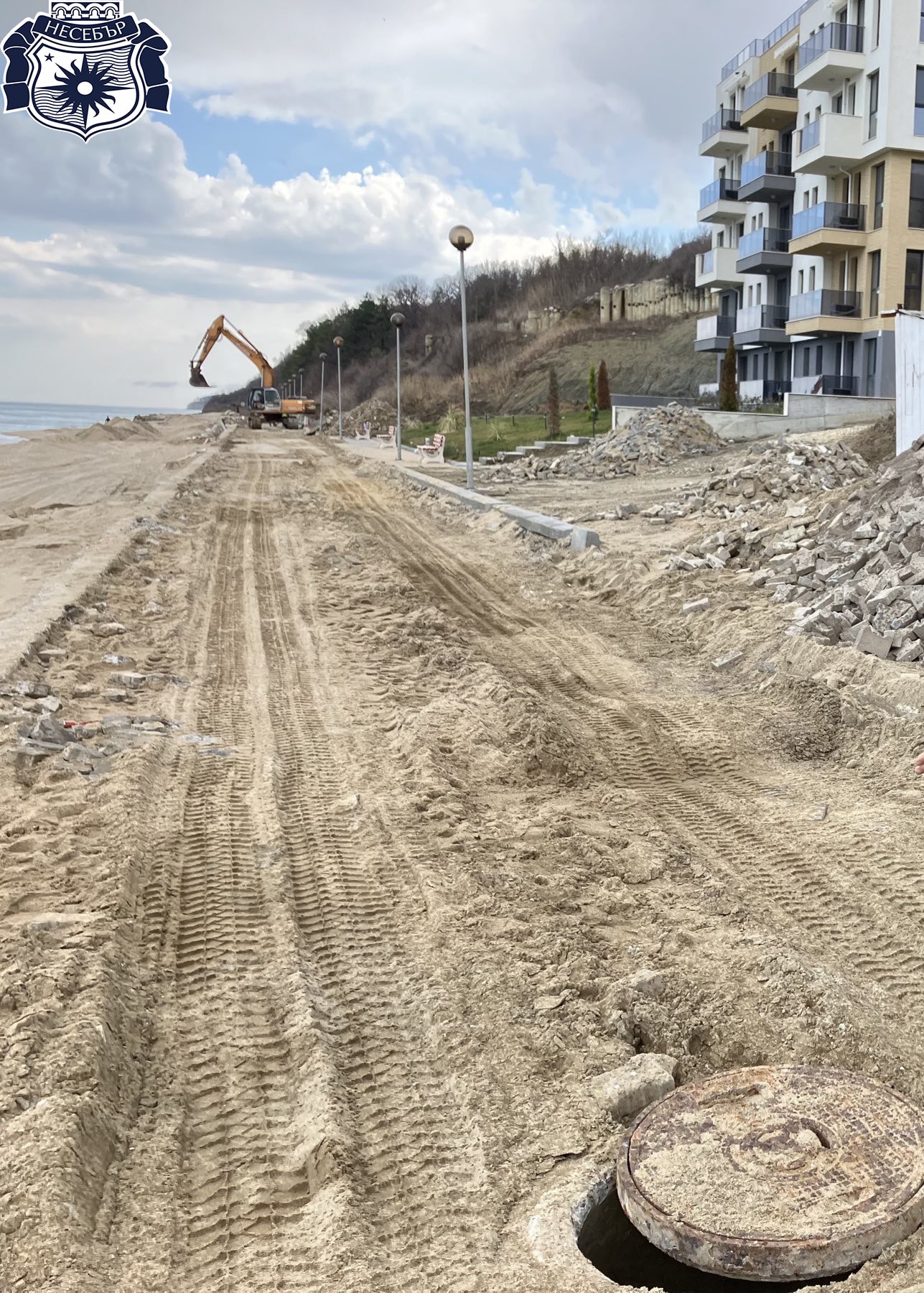 Несебърският кмет Николай Димитров огледа първоначалните дейности от втория етап на ремонта на крайбрежната алея с канализационен колектор Ф500 в Обзор. Алейната настилка е била премахната и са започнати изкопни работи.