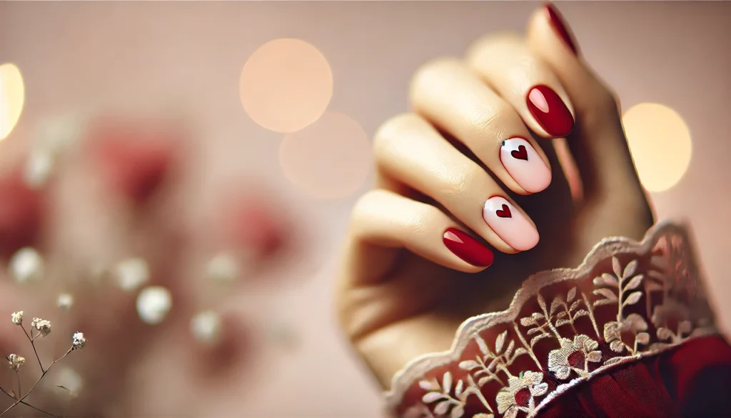 Например, можете да нанесете гланцов червен лак върху някои нокти, а върху останалите – матов вариант на същия цвят. Добавянето на дискретни сърца, линии или брокатени акценти ще направи дизайна още по-интересен.