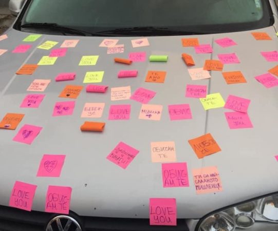 Столичен автомобил се превърна в истински хит. Причината е в това, че целият е облепен в цветни бележки, които изразяват любовта на един човек към притежателя на колата. Това става ясно от публикация в социалната мрежа Фейсбук.