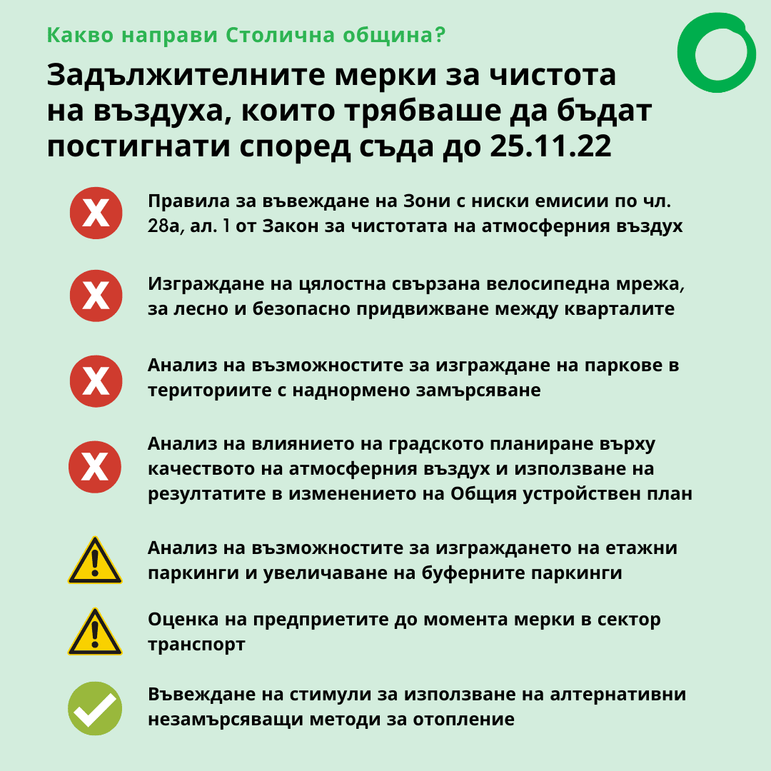„Помните ли, че Столична община беше осъдена да вземе мерки по отношение на замърсения въздух на София? Е, и последният срок за действие по този въпрос, посочен в съдебното решение на Софийски градски съд, изтече на 25 ноември 2022 г. За съжаление, повечето мерки, които съдебната институция записа като задължителни за изпълнение, не са постигнати. Юристи коментират, че това дава право на гражданите на града и всички засегнати да потърсят по легален път обезщетения от общината за причинените им вреди при всяко превишение на нормите от тук нататък, без да трябва да доказват, че Столична община е виновна за превишенията.“