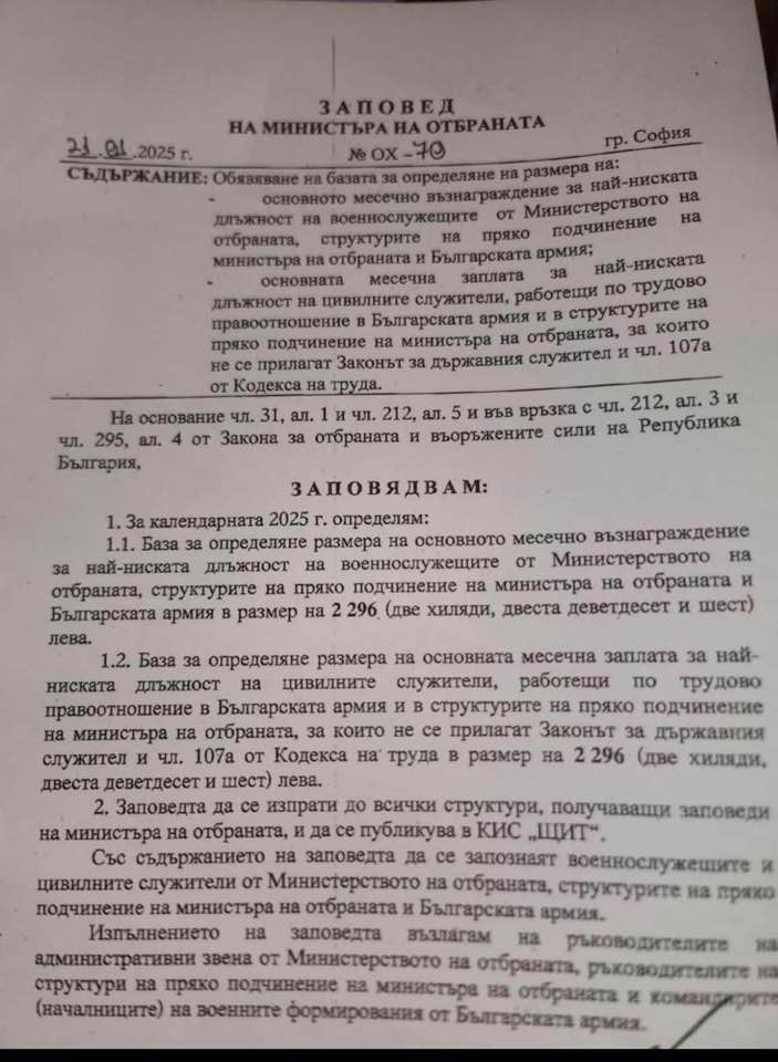 Военният министър Атанас Запрянов издаде заповед, с която обяви базата за определяне на размера на основното месечно възнаграждение за най-ниската длъжност на военнослужещите от Министерството на отбраната, структурите на пряко подчинение на министъра на отбраната и Българската армия, както и основната месечна заплата за най-ниската длъжност на цивилните служители, работещи по трудово правоотношение в Българската армия и в структурите на пряко подчинение на министъра на отбраната, за които не се прилагат Законът за държавния служител и чл. 107а от Кодекса на труда.
