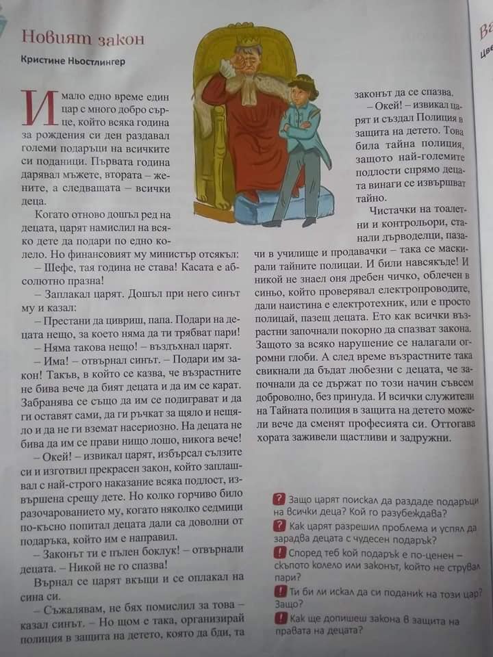 „Читанка за трети клас. Това е дъното! Крайно време е да има допитване до родителите на кое издателство да бъдат учебниците след като Законът допуска такъв избор! Погледнете за какъв изказ става дума, за какво опростачване …. При толкова богато народно творчество, при толкова прекрасни автори и произведения, децата ни да изучават такъв боклук е недопустимо! Изцяло тенденциозен текст, видимо от километри…, толкова долнопробно за четене! А въпросите към текста ги е мислил някой още по-голям умник….“