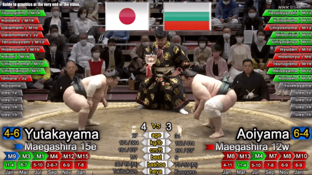 Аоияма постигна 7-ма победа, надвивайки „маегашира-15“ Ютакаяма чрез техниката „ошитаоши“. Така родният „маегашира-12“ вече е с актив от 7 победи и 4 загуби на Големия пролетен сумо турнир.