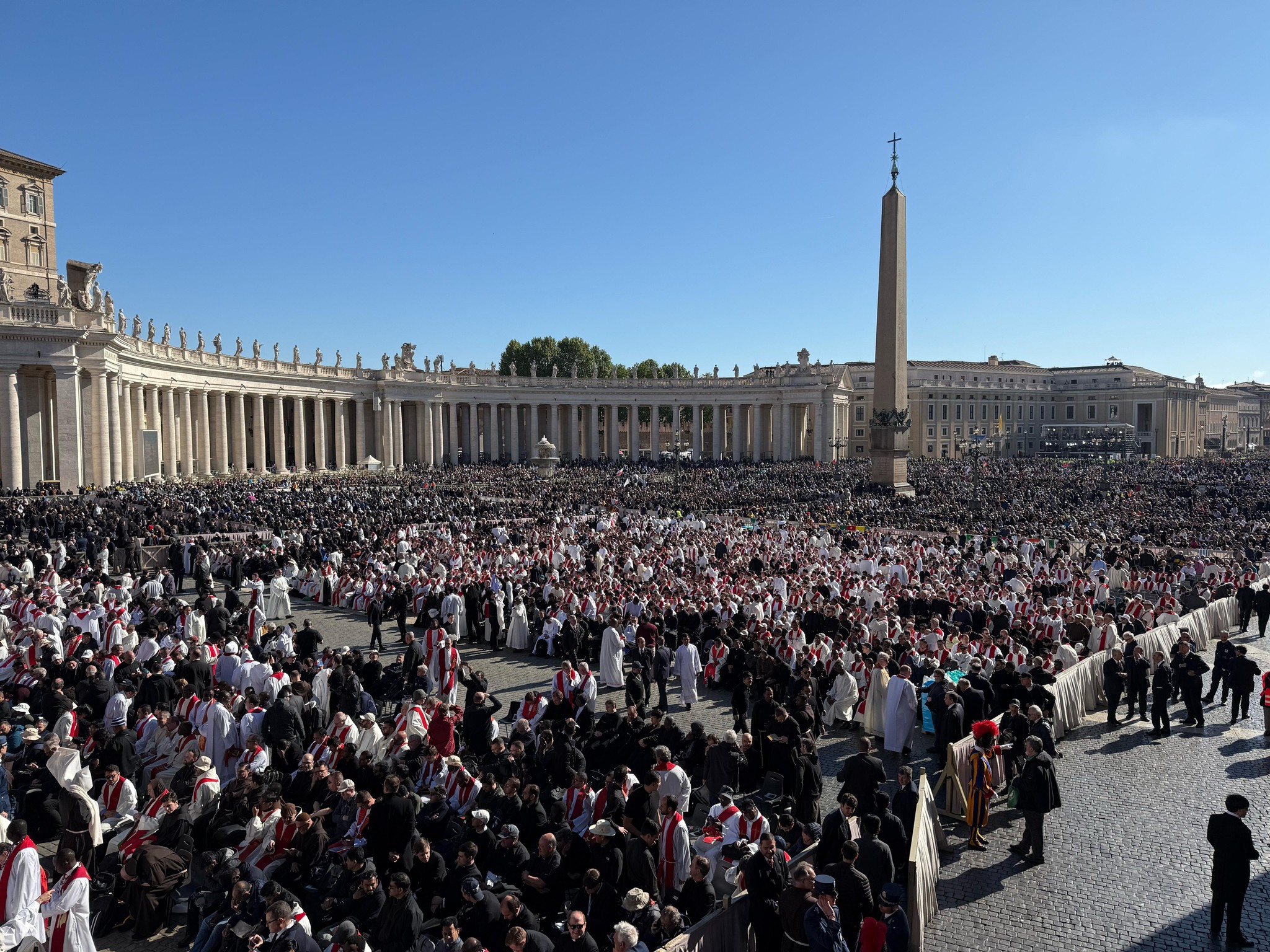Опечалените се бяха подредили по цялата улица „Виа дела Кончилиационе“, която води към Ватикана, и следяха опелото на големи екрани, разположени по обществени площади в Рим, включително пред базиликата „Санта Мария Маджоре“.