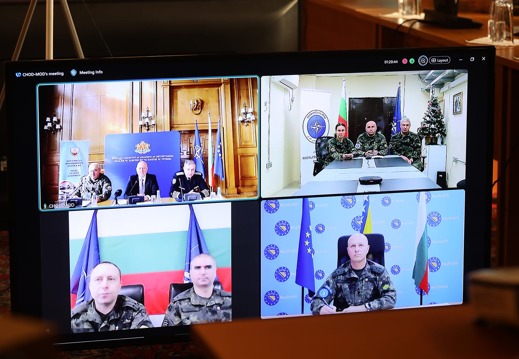 Към настоящия момент повече от 100 военнослужещи от Въоръжените сили на Република България участват в мисии и операции зад граница. По време на видеоконферентната връзка командирът на Съвместното командване на силите генерал-майор Валери Цолов представи българското участие в операцията на Европейския съюз в Босна и Херцеговина „ALTHEA”, в операцията на Стабилизиращите сили на НАТО в Косово (KFOR) и в небойната мисия на НАТО в Ирак.