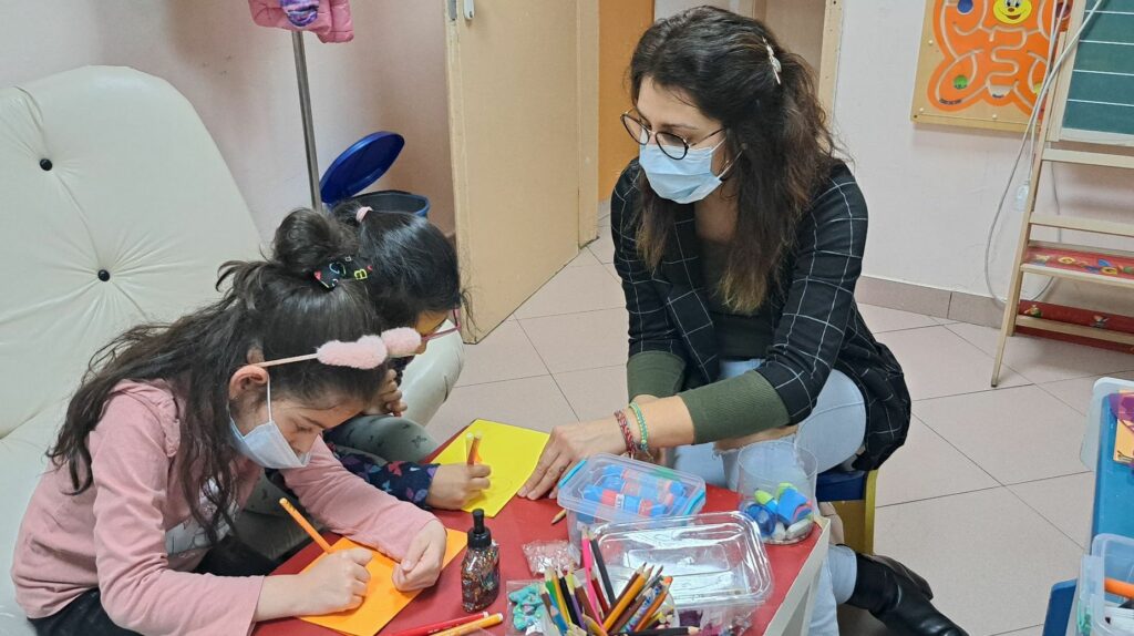 Болничните стаи са превърнати в пространство за изкуство, където децата работят с преподаватели и ученици. Ръководител на арт ателието е Ивелина Петрова – художник, арт терапевт от 2015 г. година в университетската болница. За нея няма непознати техники на визуалните и приложни изкуства и признава, че изкуството помага за емоционалната подкрепа на боледуващите деца и техните родители. Така през годините клиниката променя облика си и средата става по-цветна с витражи и рисунки на приказни герои по стените.