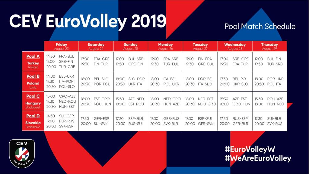 Европейското ще се проведе от 23 август до 8 септември, като това ще е първият случай, в който четири държави ще приемат надпреварата. Домакините (Турция, Полша, Унгария и Словакия) бяха поставени като водачи във всяка от четирите групи.