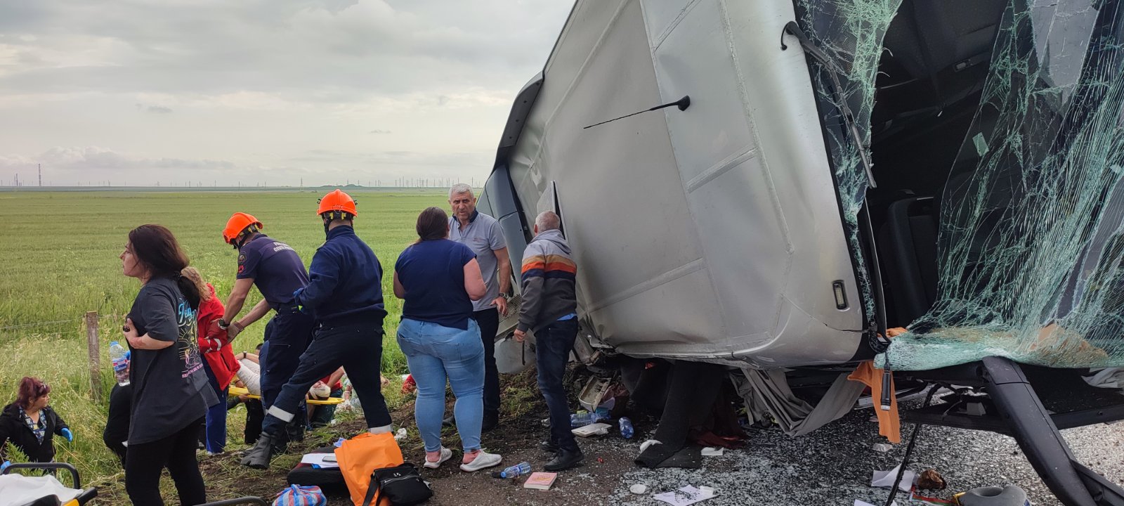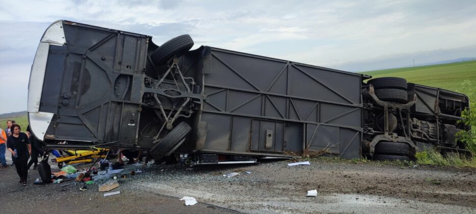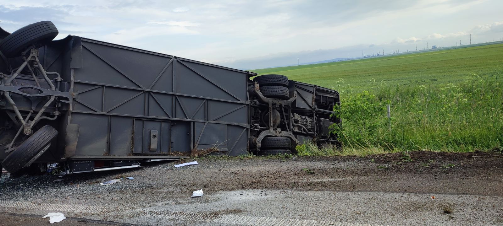Около 17:17 часа днес е било получено съобщение за самостоятелен пътен инцидент с туристически автобус, осъществен в района на км 356 на АМ “Тракия” в посока Бургас. При него, вероятно поради заспиване на 45-годишния водач, автобусът първоначално се е блъснал в билборд, а после се е обърнал в крайпътната канавка.