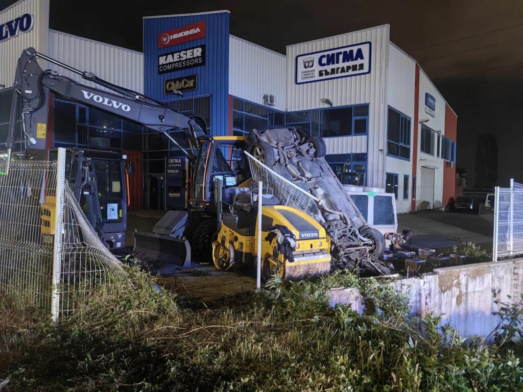 Автомобилът е поднесъл няколко пъти и накрая се е забил в багер. Той е бил паркиран пред сградата на фирма.