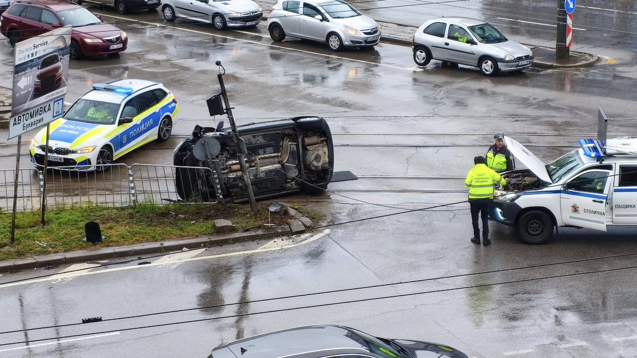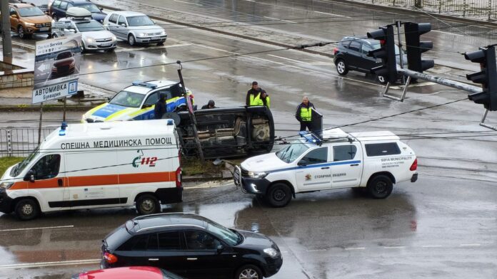 Кола се е преобърнала на една страна, а на мястото има полиция и линейка. Все още не е ясно дали има пострадали хора и какво е състоянието им.