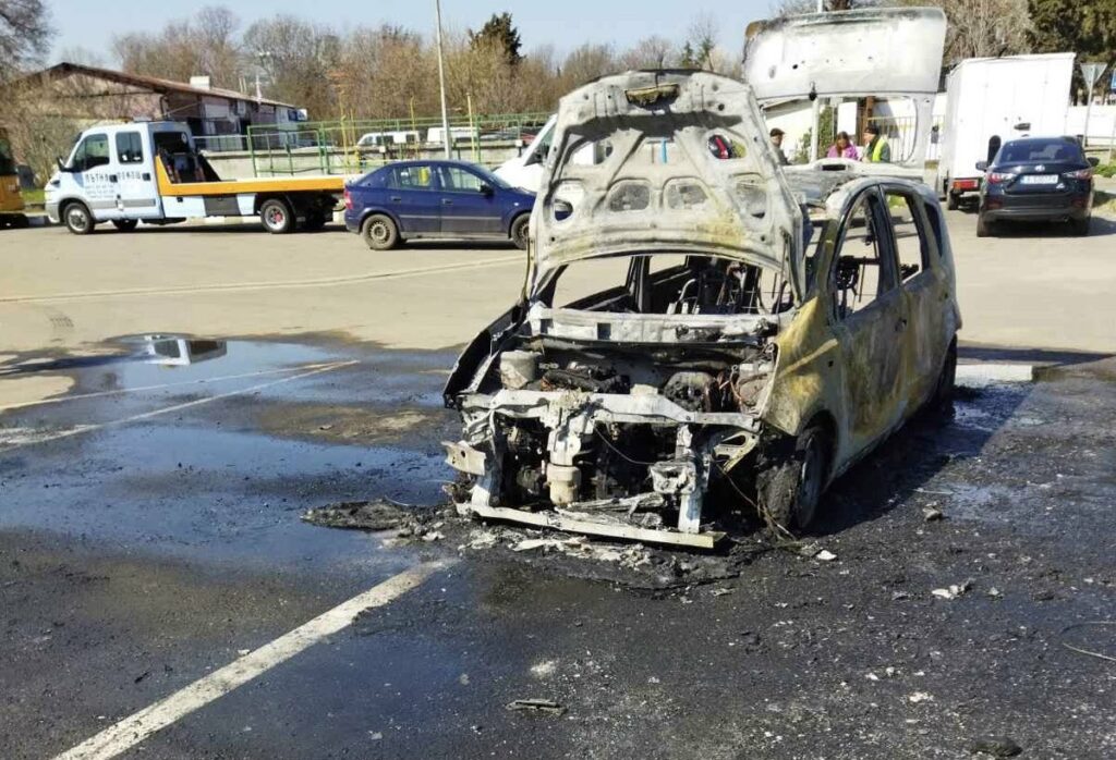 В резултат на удара автомобилът се е запалил, а мотоциклетистът във видимо тежко състояние е откаран болнично заведение.